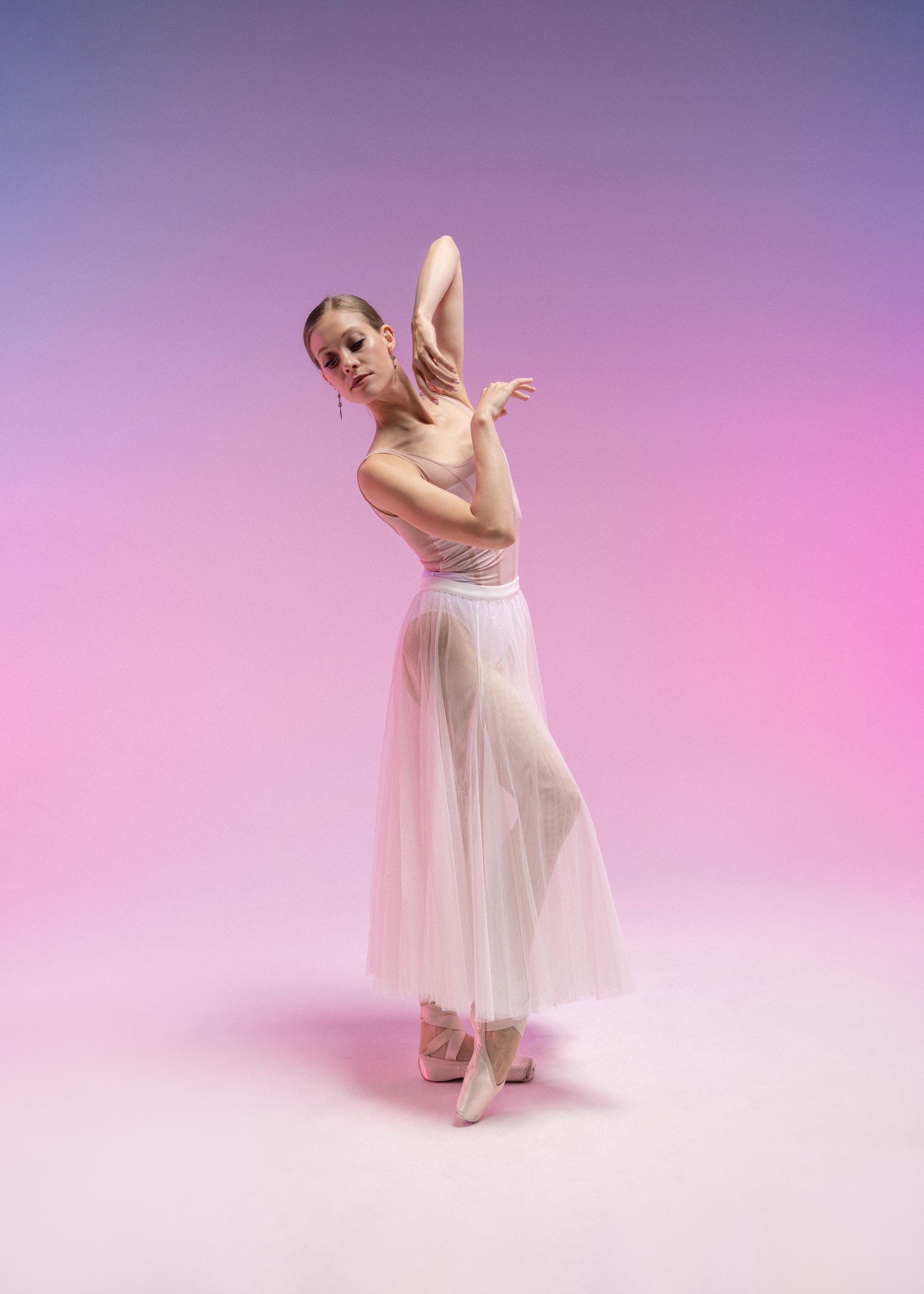 Chiffon, the traditional fabric used in a ballerina's skirt is typically made of Polyester, Sophie and ACC decided to go with this particular fabric because it is a more sustainable option for the traditional look. rPET reduces the need for primary extraction and uses 30-50% less energy to produce.